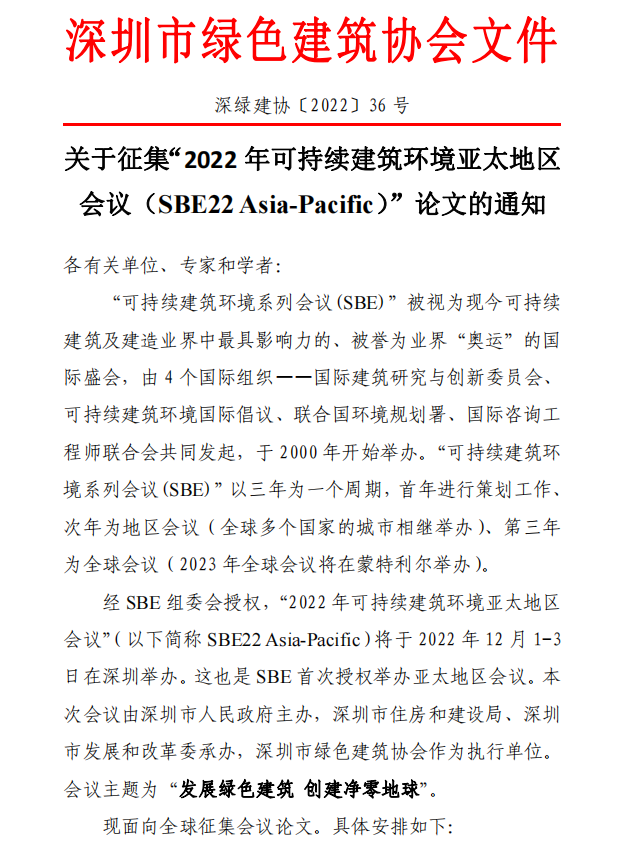 關(guān)于征集“2022年可持續(xù)建筑環(huán)境亞太地區(qū)會議(SBE22 Asia-Pacific)”論文的通知