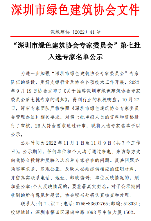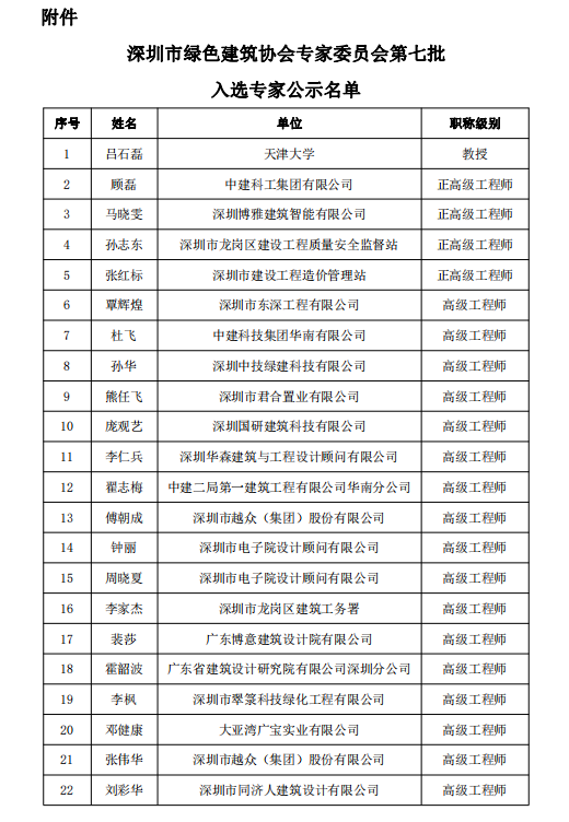 “深圳市綠色建筑協(xié)會專家委員會”第七批入選專家名單公示