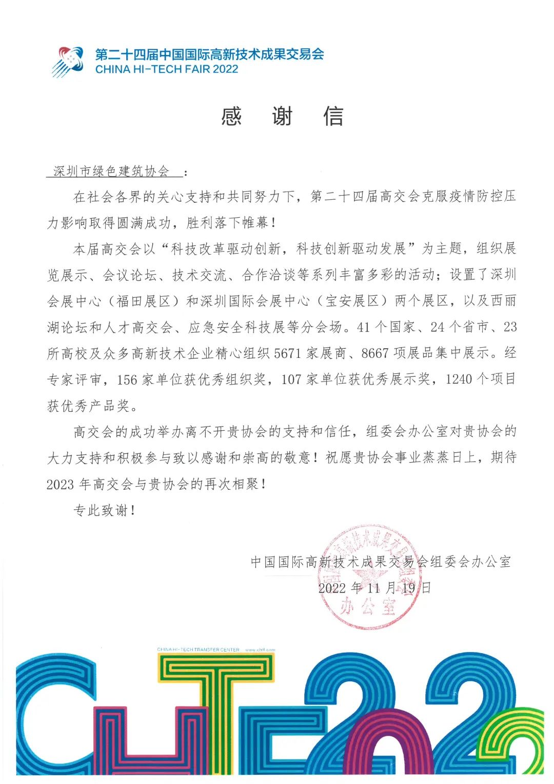 作為高交會“建筑科技創(chuàng)新展”合作組織單位,深圳市綠色建筑協(xié)會積極組織發(fā)動建筑行業(yè)企業(yè)參展,并在會期內(nèi)組織了綠色建筑產(chǎn)品與技術(shù)路演、“跑起來蓋個章”、“繪出我們的美好家園”等豐富多彩的活動,積極搭建行業(yè)展示平臺、擴(kuò)大展區(qū)影響力。本屆高交會結(jié)束后,高交會組委會辦公室向協(xié)會發(fā)來感謝信,并頒發(fā)“優(yōu)秀組織獎”牌匾。