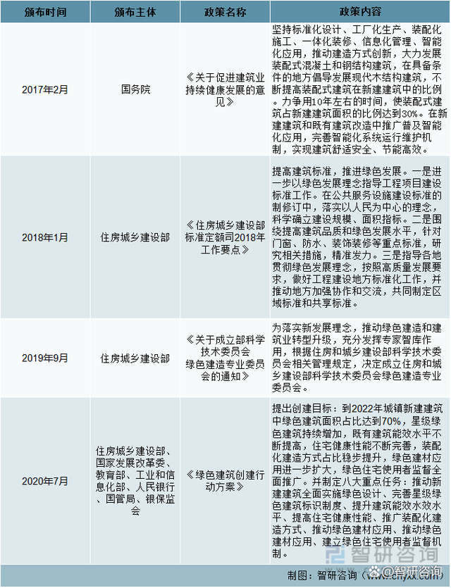 2017-2022年期間,國務(wù)院、國家發(fā)改委、住房城鄉(xiāng)建設(shè)部、工信部、生態(tài)環(huán)境部、能源局等多部門都陸續(xù)印發(fā)了支持綠色建筑行業(yè)的發(fā)展政策和指導(dǎo)意見,包括《關(guān)于促進建筑業(yè)持續(xù)健康發(fā)展的意見》、《綠色建筑創(chuàng)建行動方案》、《綠色建筑標識管理辦法》、《關(guān)于加快建立健全綠色低碳循環(huán)發(fā)展經(jīng)濟體系的指導(dǎo)意見》、《城鄉(xiāng)建設(shè)領(lǐng)域碳達峰實施方案》等。