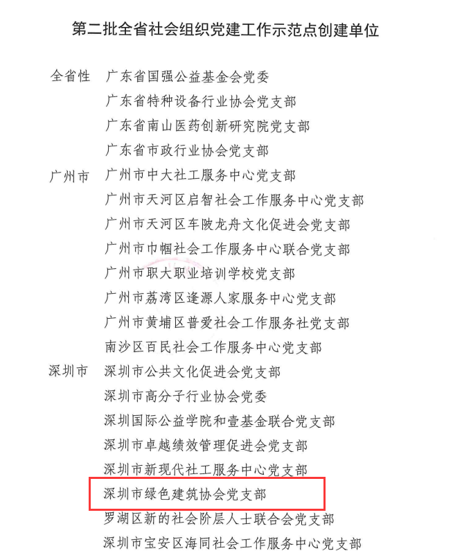 日前,中共廣東省社會(huì)組織委員會(huì)印發(fā)《省社會(huì)組織黨委關(guān)于確認(rèn)第二批全省社會(huì)組織黨建工作示范點(diǎn)創(chuàng)建單位的通知》(簡(jiǎn)稱《通知》)。深圳市綠色建筑協(xié)會(huì)黨組織被確認(rèn)為第二批全省社會(huì)組織黨建工作示范點(diǎn)創(chuàng)建單位,黨建工作再啟新征程。