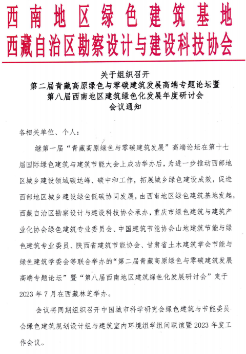 轉(zhuǎn):第二屆青藏高原綠色與零碳建筑發(fā)展高端專題論壇暨第八屆西南地區(qū)建筑綠色化發(fā)展年度研討會通知