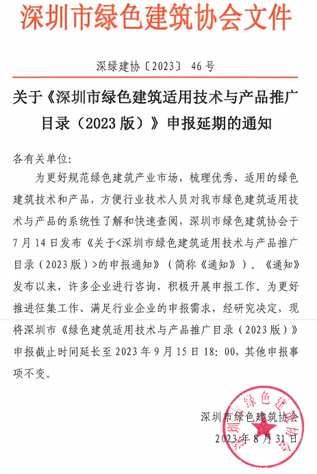 關(guān)于《深圳市綠色建筑適用技術(shù)與產(chǎn)品推廣目錄(2023版)》申報延期的通知
