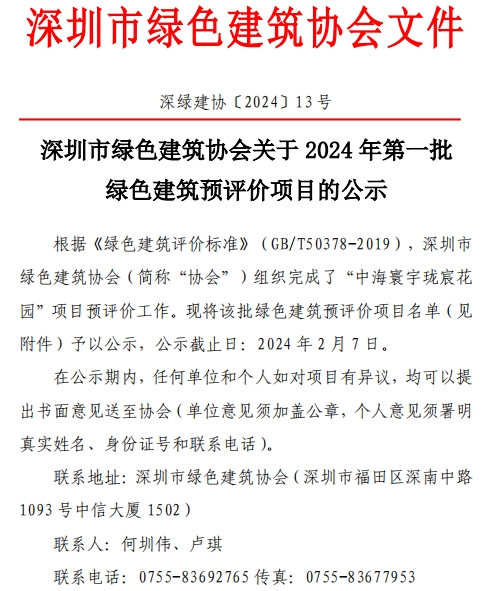 深圳市綠色建筑協(xié)會(huì)關(guān)于2024年第一批綠色建筑預(yù)評價(jià)項(xiàng)目的公示