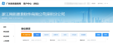 點(diǎn)擊【單位登錄】或【省政務(wù)服務(wù)網(wǎng)認(rèn)證入口】。登錄后,進(jìn)入單位用戶(hù)中心。可以看到【單位事項(xiàng)】和【人員管理】功能。