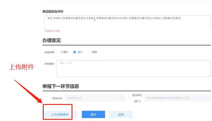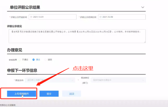 七、上傳單位承諾書(shū)及審核完成信息后,審核提交選擇業(yè)務(wù):報(bào)送去向及報(bào)送單位。提交后,業(yè)務(wù)將繼續(xù)在單位進(jìn)行評(píng)前公示環(huán)節(jié),打印評(píng)前公示表。(備注:公示日期不少于5個(gè)工作日)