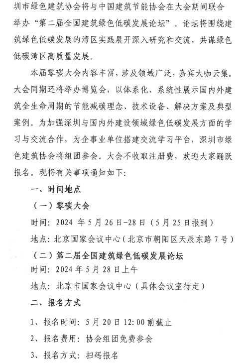 深圳市綠色建筑協(xié)會(huì)關(guān)于組團(tuán)參加“2024國際零碳城市鄉(xiāng)村與零碳建筑大會(huì)暨技術(shù)設(shè)備博覽會(huì)”的通知