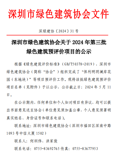 深圳市綠色建筑協(xié)會關(guān)于2024年第三批綠色建筑預(yù)評價項目的公示