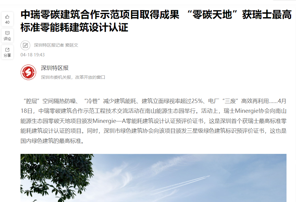 2020年中國住建部與瑞士聯(lián)邦外交部雙方簽署了“中瑞關(guān)于在建筑節(jié)能領(lǐng)域發(fā)展合作的諒解備忘錄”,在此備忘錄的框架下,雙方開展節(jié)能建筑及零排放建筑領(lǐng)域的合作與技術(shù)交流。2022年4月12日,國家住建部批復(fù)三個中瑞零碳建筑合作示范項目,在深圳市住房和建設(shè)局、深圳市綠色建筑協(xié)會的共同推動下,“南山能源生態(tài)園零碳天地”項目(以下簡稱“項目”)成功入選,成為首批三個示范項目之一。