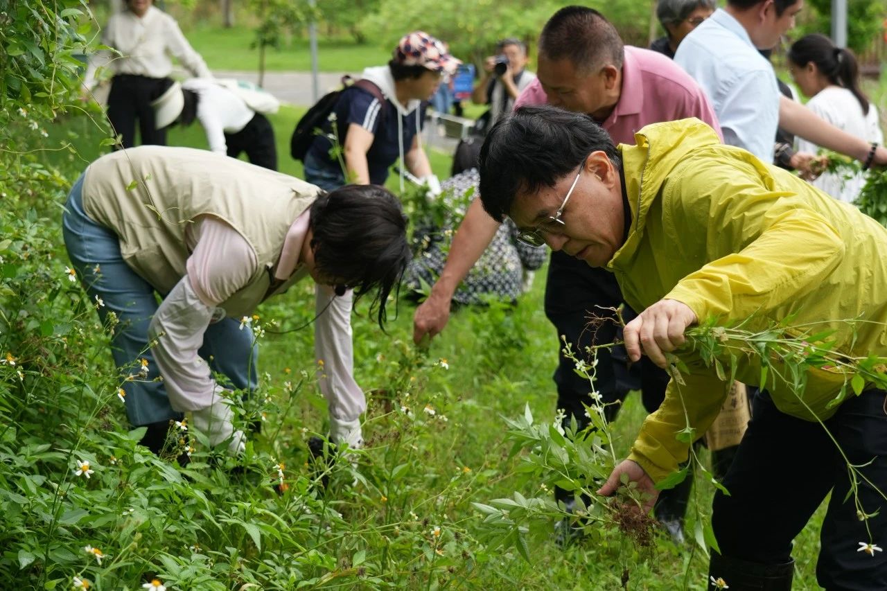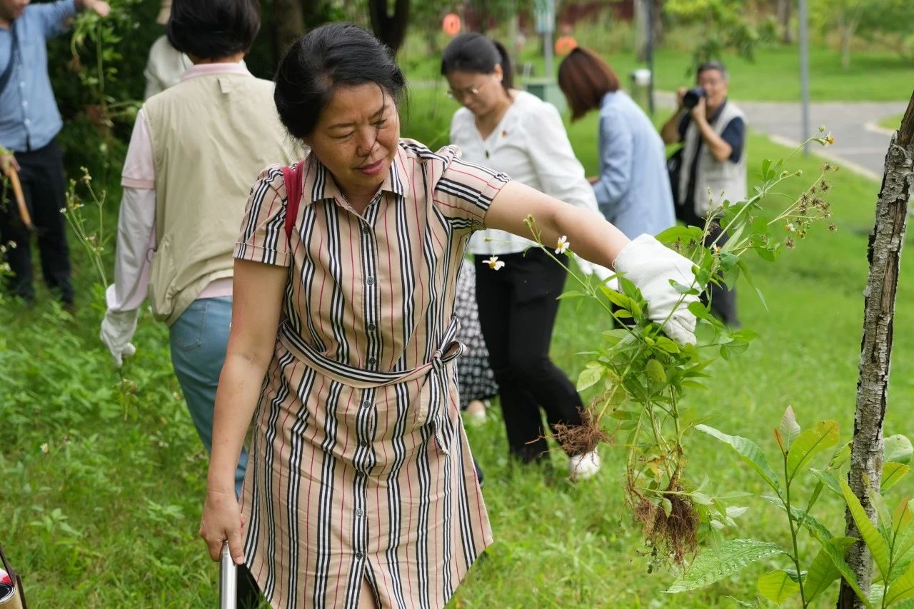 活動(dòng)進(jìn)入戶外部分,各組織代表們紛紛拿起花鋤、換上雨靴,跟隨志愿者學(xué)習(xí)外來入侵植物相關(guān)知識(shí)和清理工作的注意事項(xiàng),在雨后的生態(tài)公園生態(tài)修復(fù)區(qū)中開始了“打綠怪——清理外來物種”體驗(yàn)活動(dòng),為生態(tài)公園清理在草坪上蔓延的白花鬼針草。