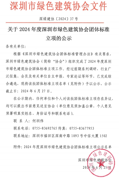 關(guān)于2024年度深圳市綠色建筑協(xié)會團(tuán)體標(biāo)準(zhǔn)立項的公示