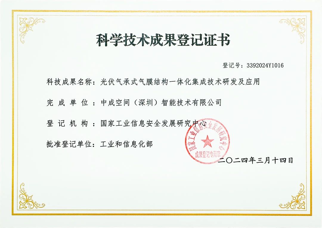 近日,中成空間光伏氣膜技術(shù)憑借其卓越的科技實(shí)力,榮膺國(guó)家工業(yè)信息安全發(fā)展研究中心頒發(fā)的“科學(xué)技術(shù)成果登記證書”,這是繼國(guó)家工信部產(chǎn)業(yè)發(fā)展促進(jìn)中心創(chuàng)新應(yīng)用獎(jiǎng)后,中成空間光伏氣膜技術(shù)榮獲的又一國(guó)家級(jí)榮譽(yù),實(shí)力再獲專業(yè)認(rèn)可。