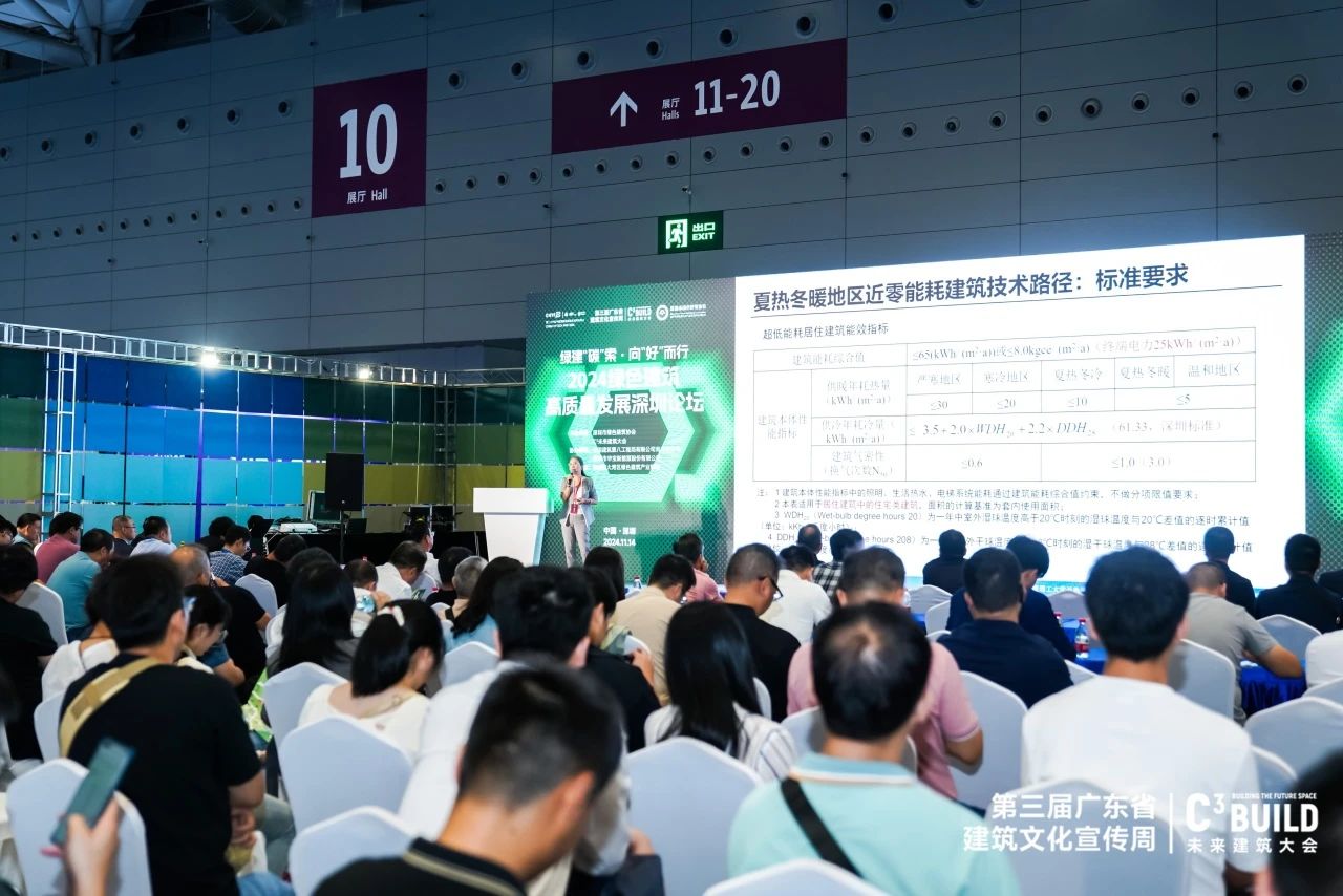 華南理工大學(xué)教授趙立華基于《近零能耗建筑技術(shù)標(biāo)準(zhǔn)》(GB/T 51350-2019)的相關(guān)規(guī)定和要求,介紹了夏熱冬暖地區(qū)近零能耗建筑技術(shù)路徑,分享廣東省的近零能耗與零能耗工程案例的主要技術(shù)和經(jīng)驗。深圳市綠色建筑協(xié)會副會長、深圳萬都時代綠色建筑技術(shù)有限公司董事長蘇志剛結(jié)合在綠色建筑領(lǐng)域的探索及實踐經(jīng)驗,提出“綠色金字塔”體系模型,將綠色建筑全生命周期發(fā)展路徑及其9個階段的價值完整呈現(xiàn)。深圳市特區(qū)建工科工集團(tuán)總工程師顧磊通過兩類不同業(yè)態(tài)的裝配式建筑實踐,探索了裝配式建筑在綠色節(jié)能降碳領(lǐng)域的積極應(yīng)用。中國建筑標(biāo)準(zhǔn)設(shè)計研究院技術(shù)發(fā)展中心主任徐愷介紹了綠色建材的發(fā)展背景、現(xiàn)狀,并提出搭建世界范圍內(nèi)的建筑綠色供應(yīng)鏈條的發(fā)展思路。深圳市華寶新能源股份有限公司光伏產(chǎn)品研發(fā)總監(jiān)于華君在演講中表示,在國家大力發(fā)展可再生能源的背景下,該公司研發(fā)的創(chuàng)新產(chǎn)品致力于實現(xiàn)光伏技術(shù)與屋頂美學(xué)的深度融合。