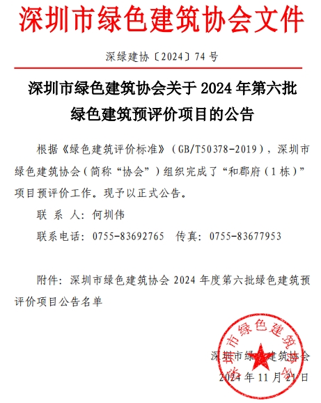 深圳市綠色建筑協(xié)會(huì)關(guān)于2024年第六批綠色建筑預(yù)評(píng)價(jià)項(xiàng)目的公告