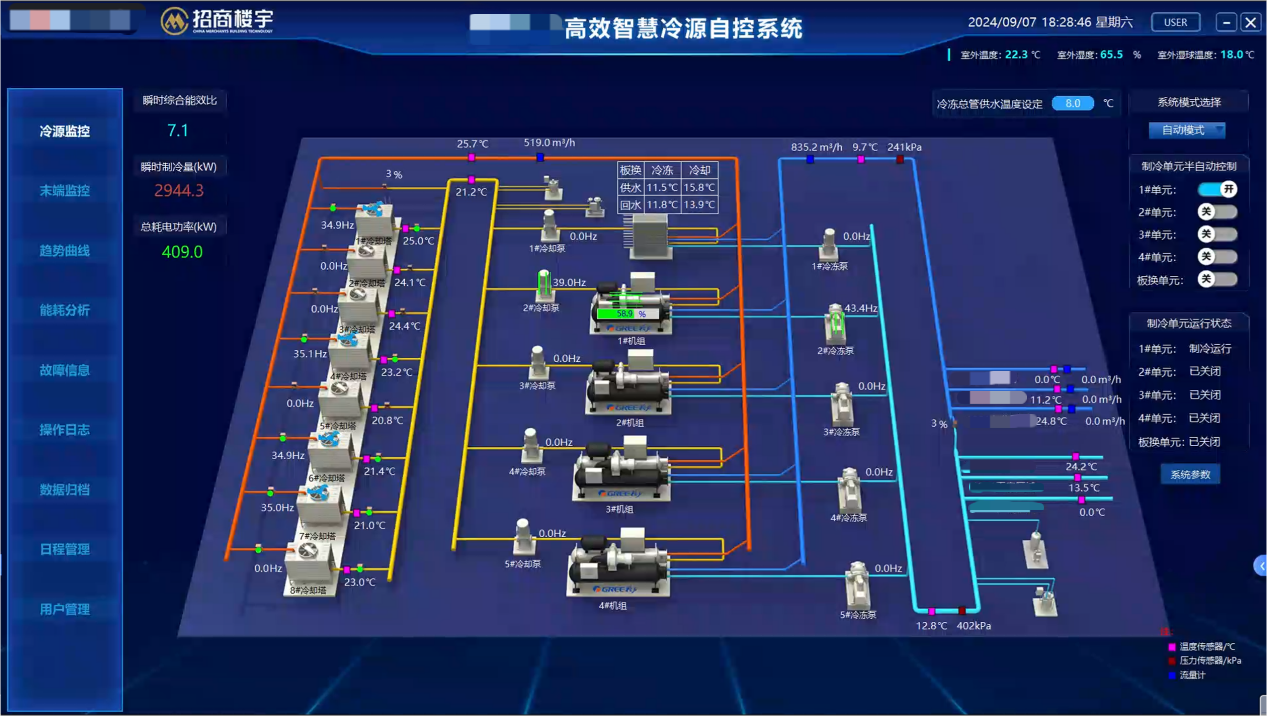 冷站系統(tǒng)按智慧高效機(jī)房標(biāo)準(zhǔn)打造,制冷系統(tǒng)可實(shí)現(xiàn)在室外溫度較低時,自動切換至板換供冷模式,達(dá)到高效節(jié)能的效果。