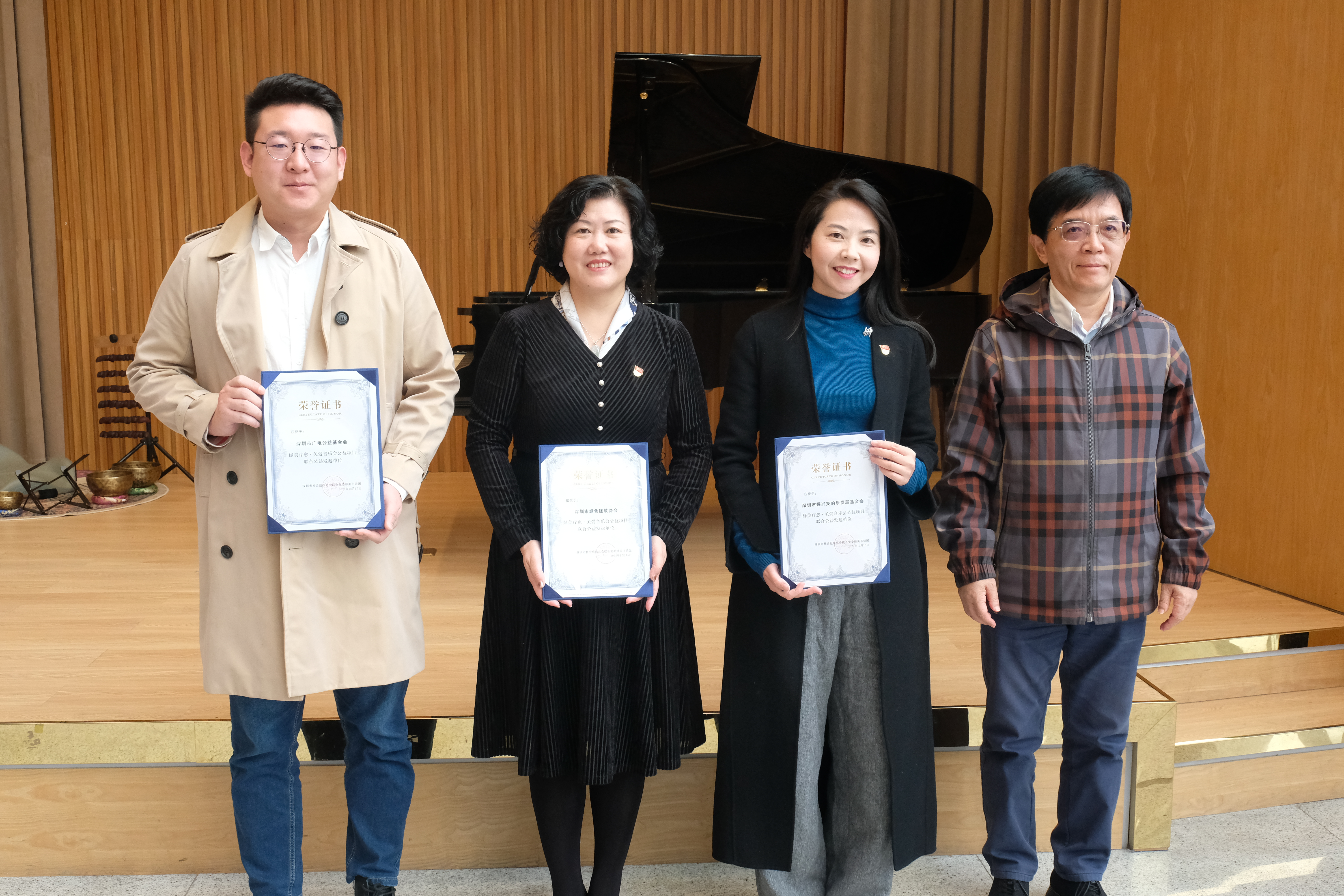 活動(dòng)最后,舉辦深圳市社會(huì)組織總會(huì)聯(lián)合黨委“綠美書(shū)記團(tuán)”授榮儀式,分別授予主辦、承辦、合作、支持機(jī)構(gòu)“綠美療愈.關(guān)愛(ài)音樂(lè)會(huì)公益項(xiàng)目聯(lián)合公益發(fā)起單位”榮譽(yù)證書(shū)。綠美書(shū)記團(tuán)團(tuán)長(zhǎng)、深圳市綠色建筑協(xié)會(huì)黨支部書(shū)記、秘書(shū)長(zhǎng)王向昱作為主辦單位代表參加儀式。