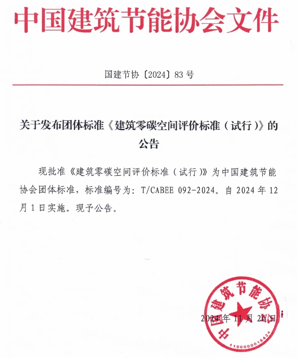 日前,中國建筑節(jié)能協(xié)會(huì)印發(fā)通知,批準(zhǔn)《建筑零碳空間評(píng)價(jià)標(biāo)準(zhǔn)(試行)》為中國建筑節(jié)能協(xié)會(huì)團(tuán)體標(biāo)準(zhǔn),標(biāo)準(zhǔn)編號(hào)為:T/CABEE 092-2024,自2024年12月1日起實(shí)施。