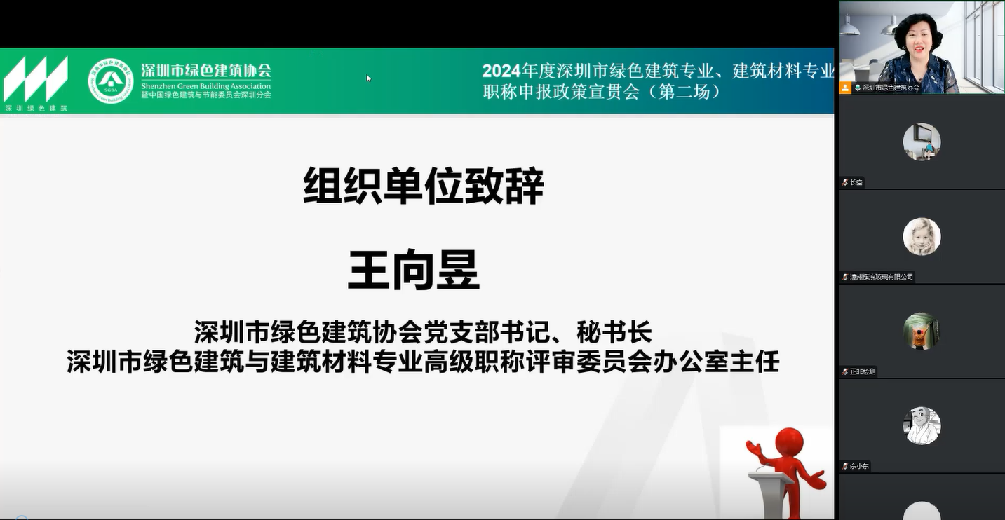 3月28日,協(xié)會(huì)組織“2024年度深圳市綠色建筑專業(yè)、建筑材料專業(yè)職稱申報(bào)政策宣貫會(huì)第二場(chǎng)(線上)”,協(xié)會(huì)黨支部書記、秘書長(zhǎng)(深圳市綠色建筑與建筑材料專業(yè)高級(jí)職稱評(píng)審委員會(huì)辦公室主任)王向昱致辭并做申報(bào)動(dòng)員講話。
