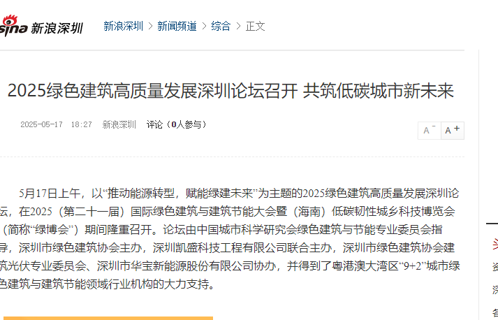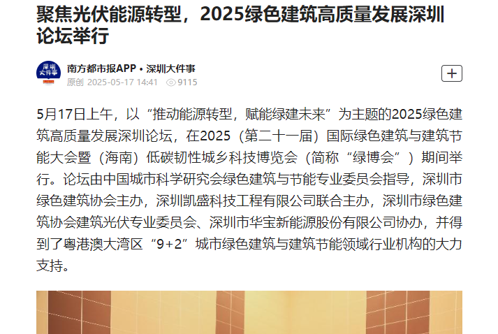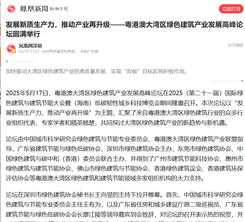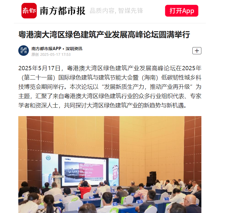 5月16至17日,2025(第二十一屆)國際綠色建筑與建筑節(jié)能大會暨(海南)低碳韌性城鄉(xiāng)科技博覽會(簡稱“綠博會”)在海南國際會展中心隆重召開。大會期間,為助推深圳以及粵港澳大灣區(qū)綠色建筑高質(zhì)量發(fā)展,深圳市綠色建筑協(xié)會聯(lián)合粵港澳地區(qū)同行業(yè)組織和有關(guān)單位舉辦“推動能源轉(zhuǎn)型,賦能綠建未來——2025綠色建筑高質(zhì)量發(fā)展深圳論壇”“發(fā)展新質(zhì)生產(chǎn)力,推動產(chǎn)業(yè)再升級——粵港澳大灣區(qū)綠色建筑產(chǎn)業(yè)發(fā)展高峰論壇”兩個專題論壇,備受媒體關(guān)注,吸引南方日報、南方都市報、深圳商報、深圳特區(qū)報、新浪網(wǎng)、鳳凰網(wǎng)等多家媒體競相報道。