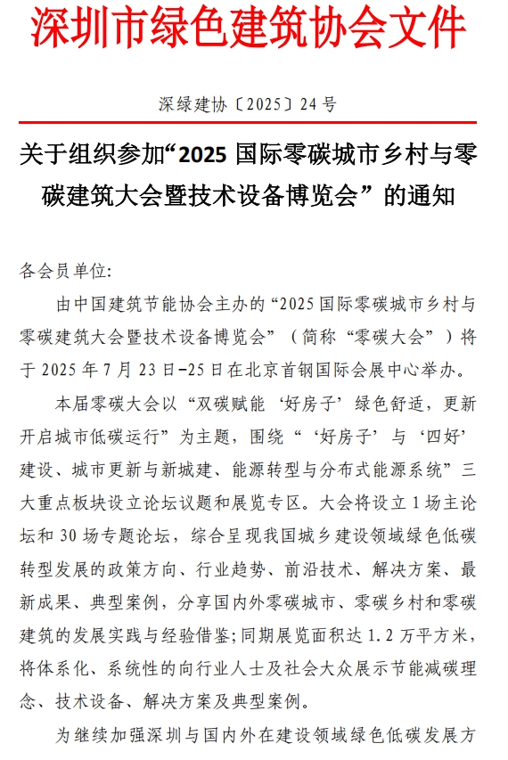 深圳市綠色建筑協(xié)會(huì)關(guān)于組織參加“2025國(guó)際零碳城市鄉(xiāng)村與零碳建筑大會(huì)暨技術(shù)設(shè)備博覽會(huì)”的通知