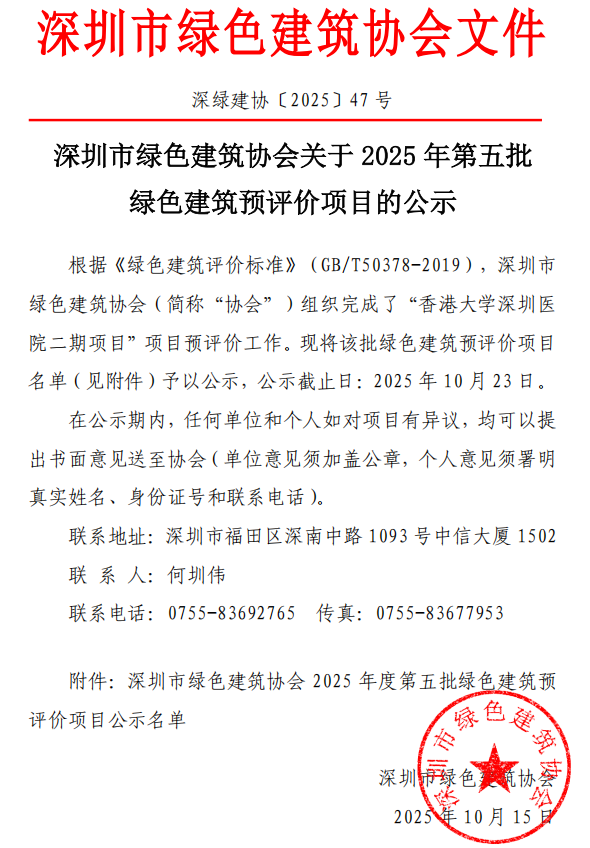 深圳市綠色建筑協(xié)會關(guān)于2025年第五批綠色建筑預(yù)評價項目的公示