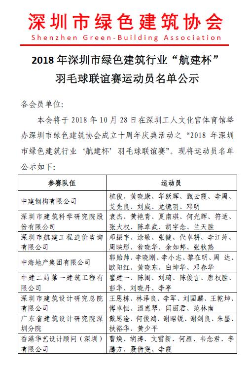 2018年深圳市綠色建筑行業(yè)“航建杯”羽毛球聯(lián)誼賽運(yùn)動(dòng)員名單公示
