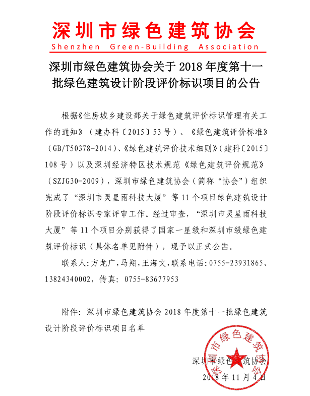 深圳市綠色建筑協(xié)會關(guān)于2018年度第十一批綠色建筑設(shè)計階段評價標識項目的公告