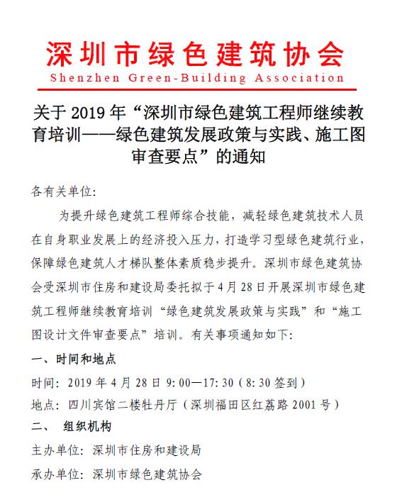 2019年“深圳市綠色建筑工程師繼續(xù)教育培訓——綠色建筑發(fā)展政策與實踐、施工圖審查要點”通知