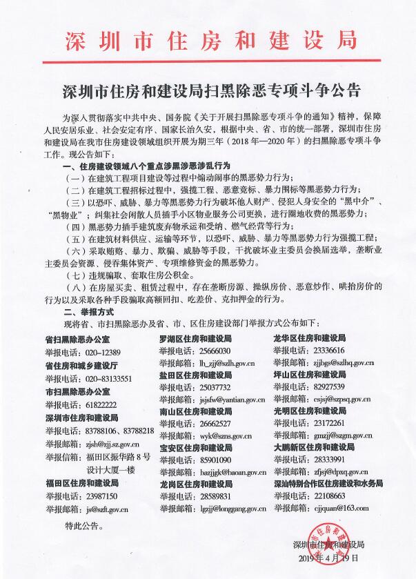 深圳市住房和建設(shè)局掃黑除惡專(zhuān)項(xiàng)斗爭(zhēng)公告