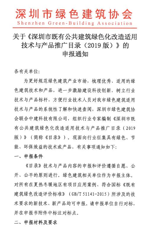 關(guān)于《深圳市既有公共建筑綠色化改造適用技術(shù)與產(chǎn)品推廣目錄(2019版)》的申報通知